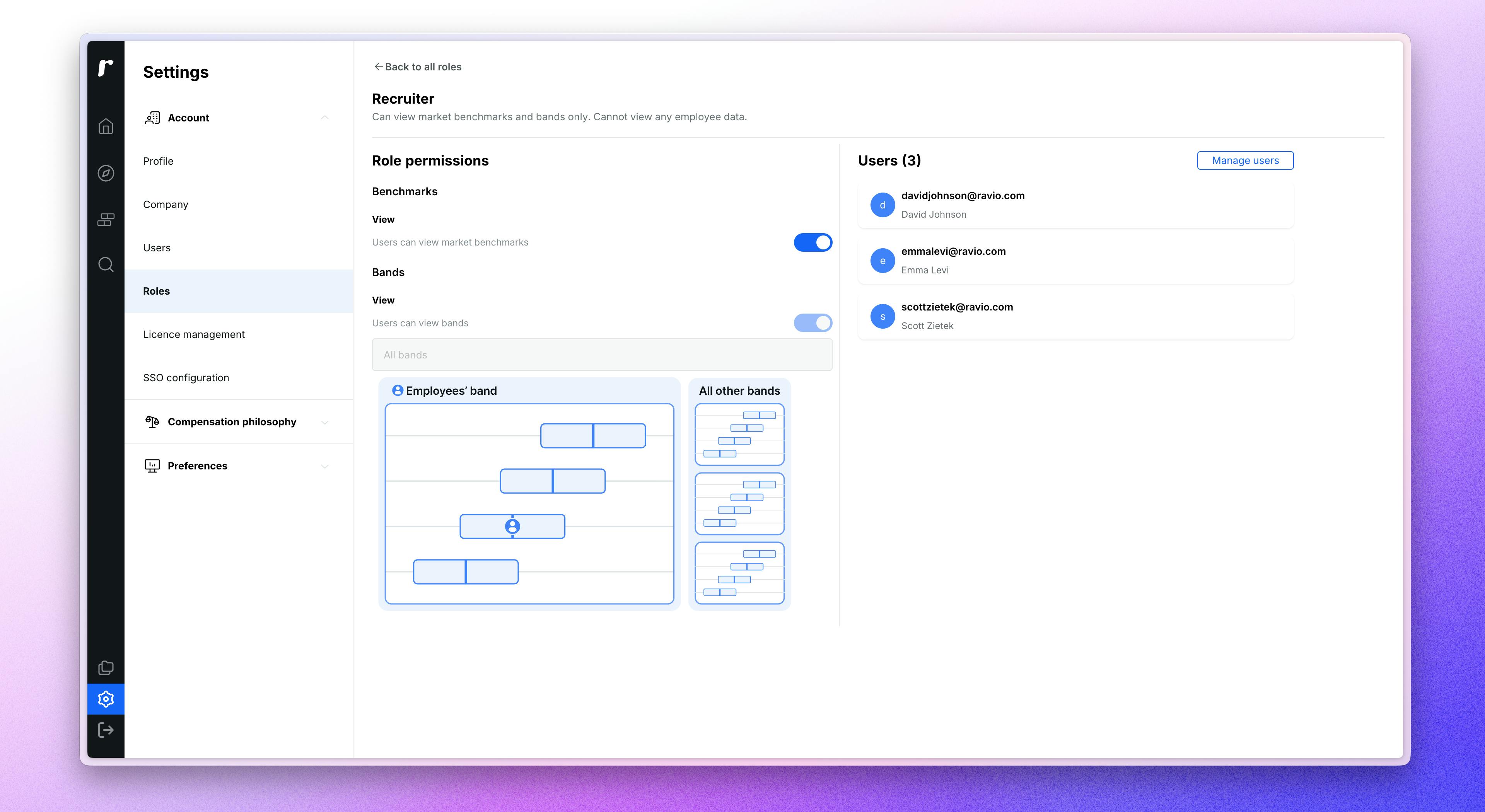 - Permission visibility: See exactly what each role can access across benchmarks, bands, and employees – so you always know who sees what.